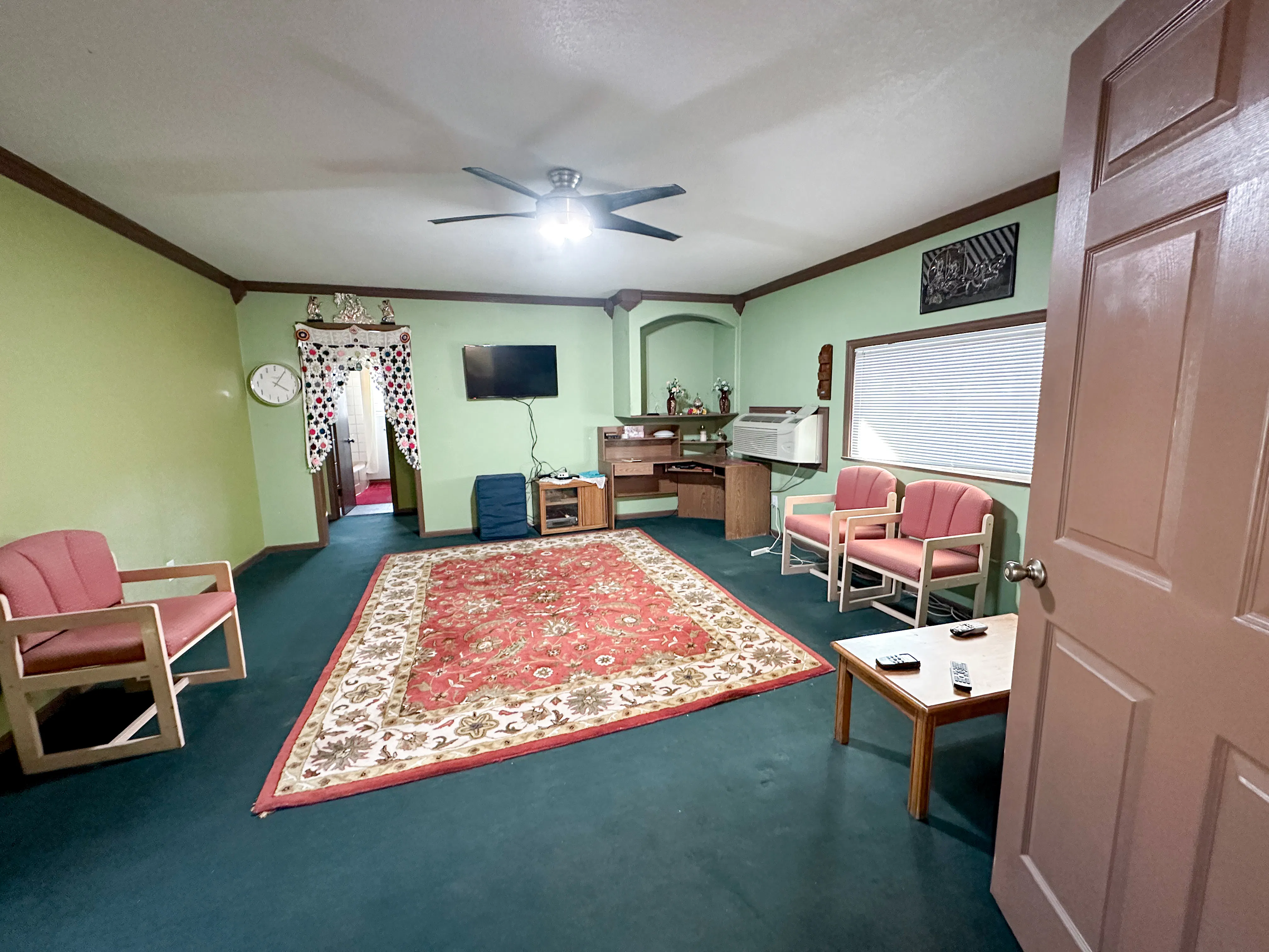 The common area has a kitchen, washer and dryer, TV, and dining area. The house also includes a covered parking spot attached to the house. Each bedroom has a queen size bed, and the bathroom is the perfect size for cleaning up after a long day.